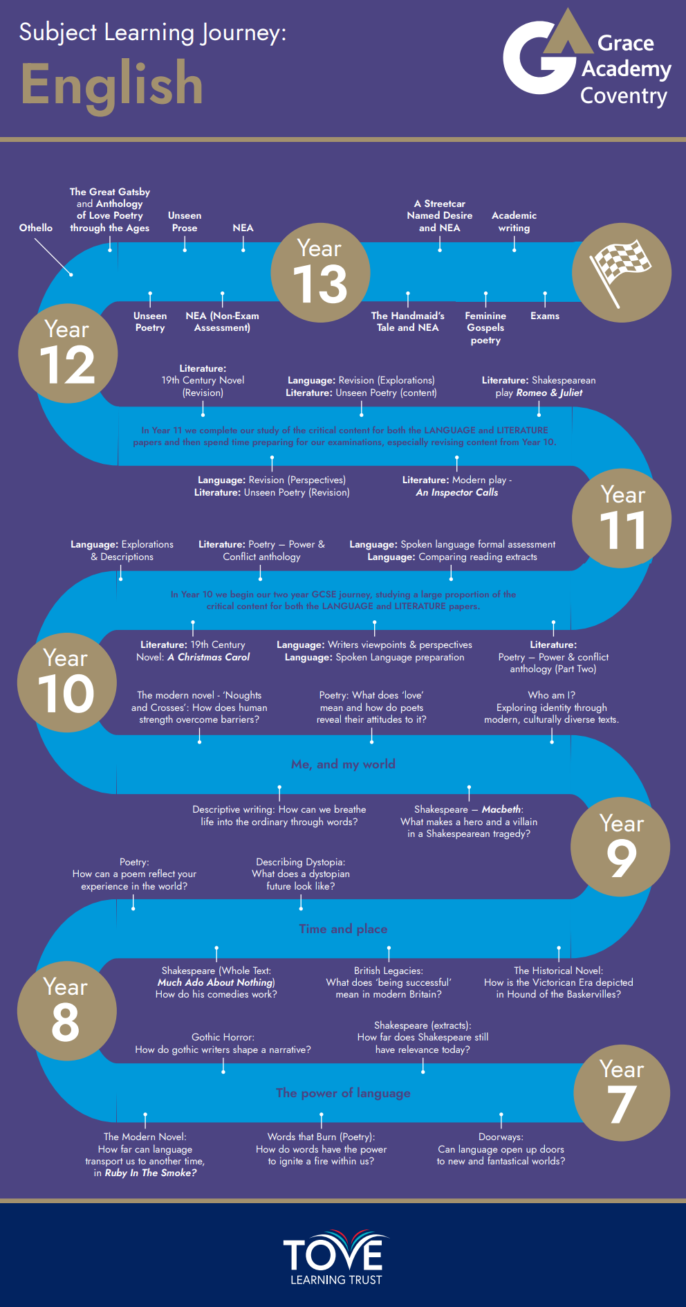 We study English to create, embed and develop a love of English Language and Literature through an appreciation of the importance of English in everyday life. We aim for students to understand the power of words, texts and spoken English in order to make sense of the world they live in. We use this to explore key identities of identity, eras and places. The key stage 3 journey is sequenced in such a way that these themes are explored systematically and logically. We simultaneously look to: