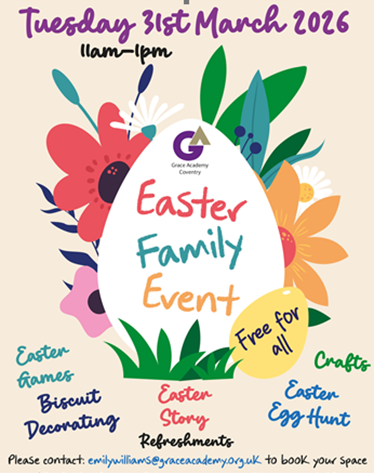 The Ethos team is holding an Easter family event on Tuesday 31st March from 11am-2pm. Please email Mrs E Williams (emilywilliams@graceacademy.org.uk) |