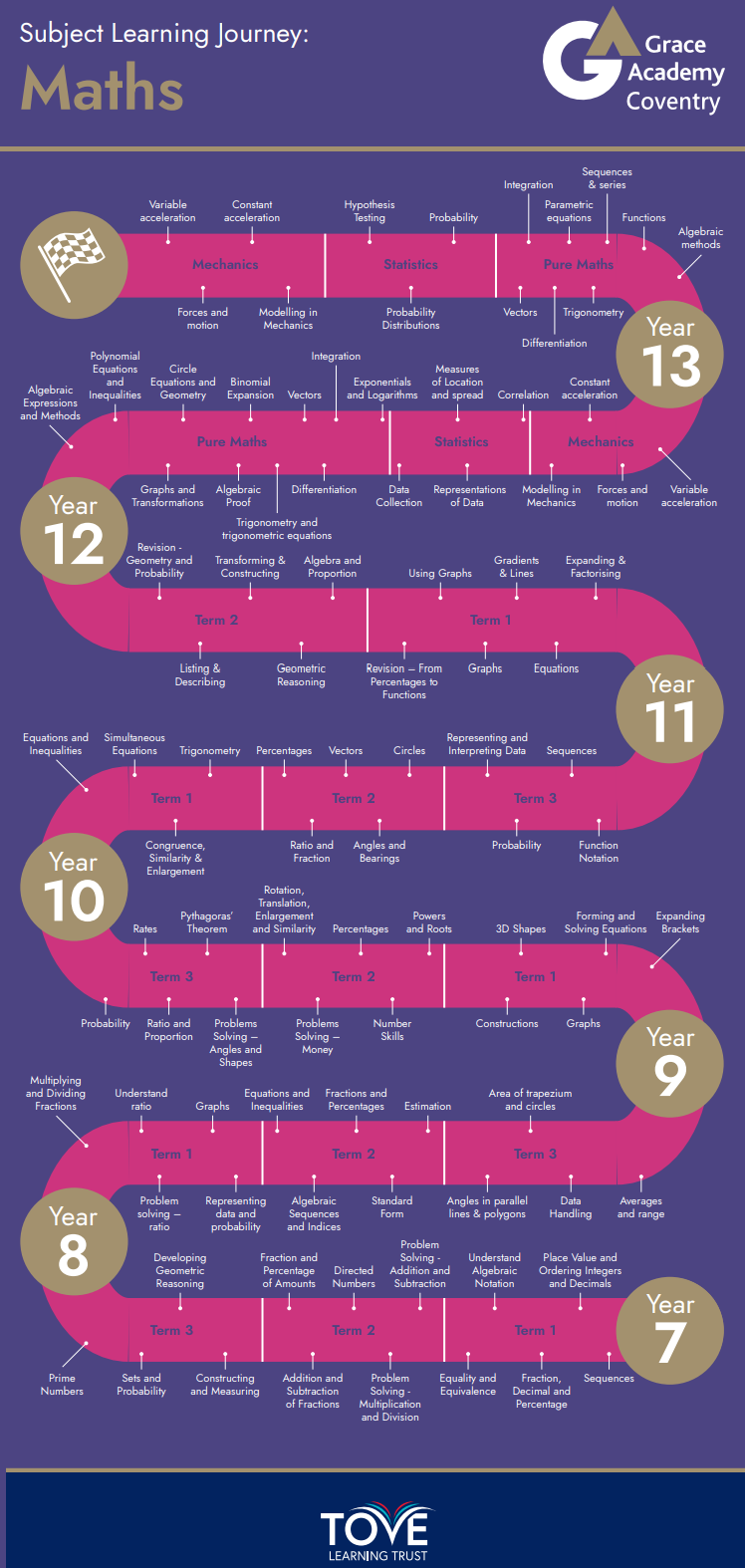 We aim to inspire students to become deep, independent and analytical learners which will enable them to have the resilience to solve everyday problems. Mathematics is critical in Science, Technology and Engineering and necessary for the advancement of our future generations. At Grace Academy Coventry we want our students to develop an appreciation of the beauty of Mathematics as well as a sense of enjoyment and curiosity for the subject.